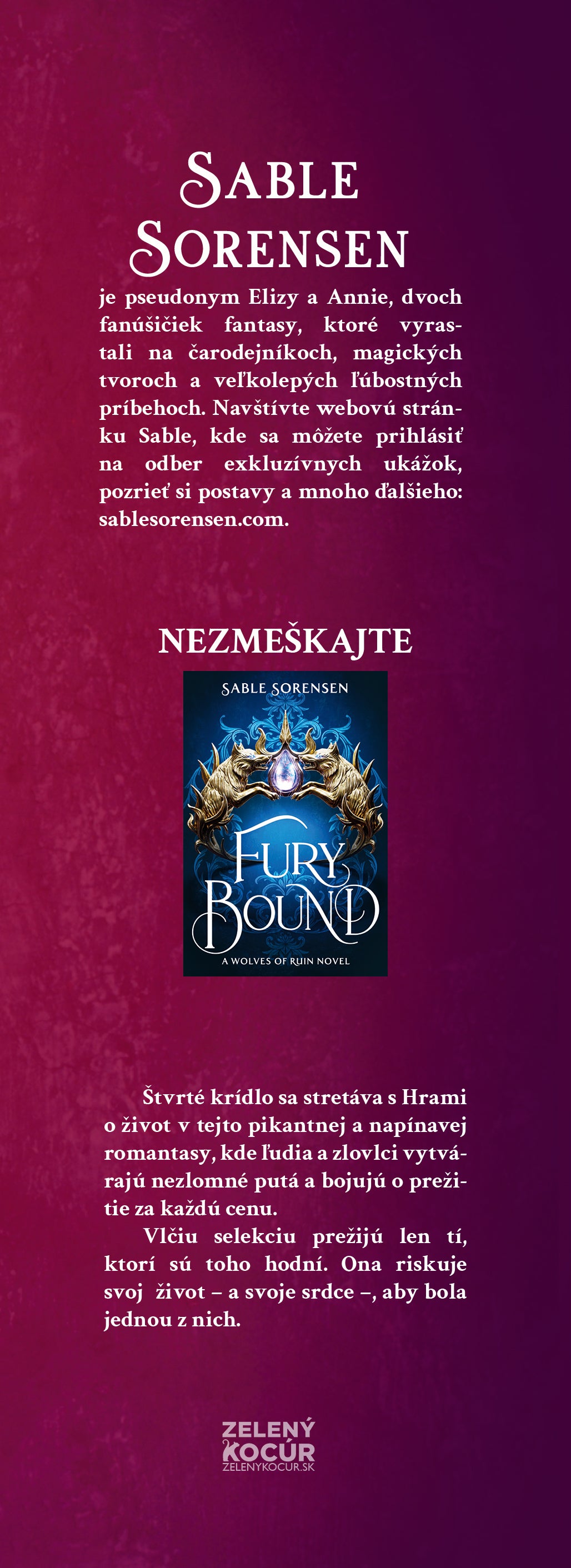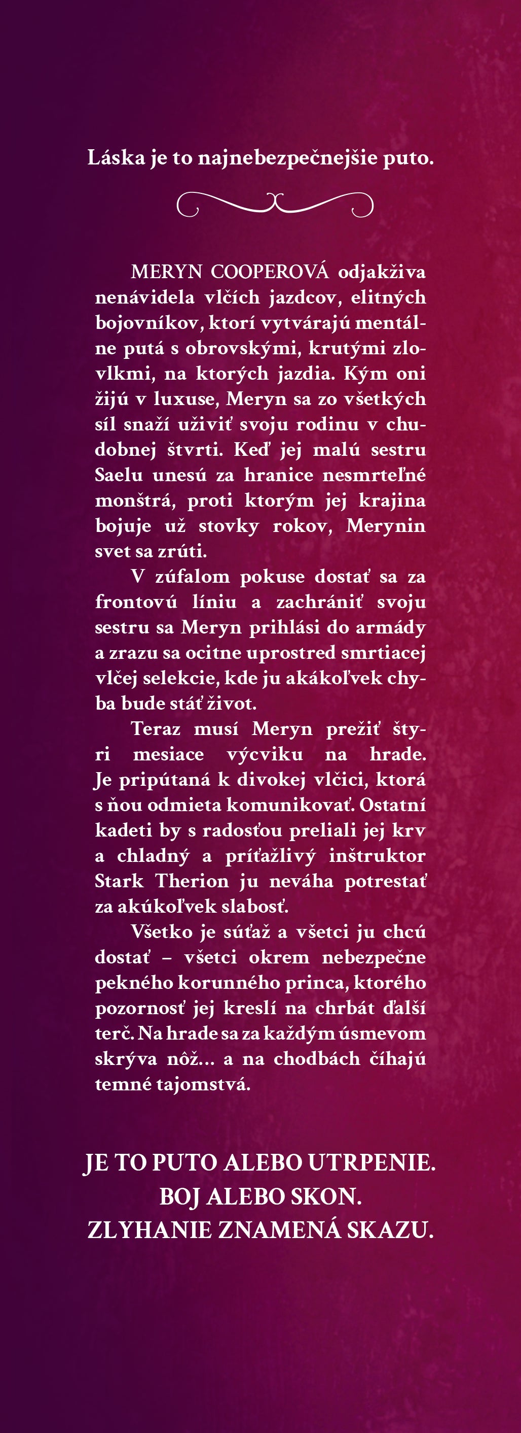 Štvrté krídlo sa stretáva s Hrami o život v tejto pikantnej a napínavej romantasy, kde ľudia a zlovlci vytvárajú nezlomné putá a bojujú o prežitie za každú cenu. Vlčiu selekciu prežijú len tí, ktorí sú toho hodní. Ona riskuje svoj život – a svoje srdce –, aby bola jednou z nich. PUTO ZLOVLKA JE NEZNIČITEĽNÉ. AK SA MU VZOPRIEŠ, ČAKÁ ŤA SMRŤ. Láska je to najnebezpečnejšie puto. Meryn Cooperová odjakživa nenávidela vlčích jazdcov, elitných bojovníkov, ktorí vytvárajú mentálne putá s obrovskými, krutými zlovlkmi, na ktorých jazdia. Kým oni žijú v luxuse, Meryn sa zo všetkých síl snaží uživiť svoju rodinu v chudobnej štvrti. Keď jej malú sestru Saelu...