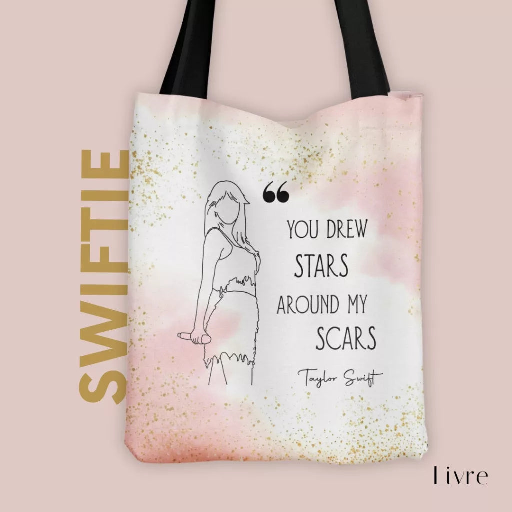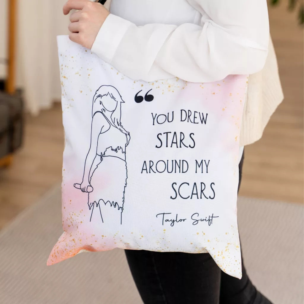 Pochváľte sa svojím hudobným vkusom touto originálnou a štýlovou plátenou taškou a nechajte sa sprevádzať slovami Taylor, nech už idete kamkoľvek. Táto taška je pre skutočné Swifties. Na taške je nápis "You drew stars around my scars", ktorý pochádza z jednej z ikonických piesní Taylor Swift. Materiál tašky: vodoodpudivýUcho: dlhéNosnosť: 10 – 15 kg